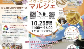 自然に囲まれたオープンガーデンを会場に、今年もイヴ・ガーデンマルシェを開催いたします。地元の新鮮野菜や、クレープ・ドリンクのキッチンカー、焼き菓子やパン、手づくり雑貨やアクセサリーなど、秋のひとときを彩る品々が並びます。さらに「彩りと癒しのプチ体験ブース」では、カラーセラピーやハンドマッサ…
